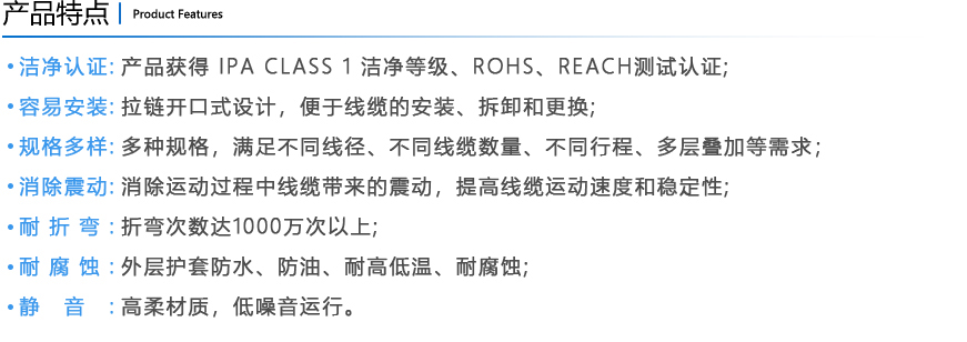 易安裝式優于封閉式拖鏈結構,外層護套采用拉鏈開口式結構,便于線纜的安裝和更換。中間線纜由柔性線卡分隔和固定,提高線纜排布的速度和美觀度,同時減少線纜絕緣層的磨損,延長線纜的使用壽命。支持多層疊加,支持龍骨支撐,滿足長行程應用場景。